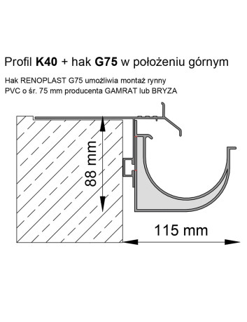 Kompatybilny z rynnami o średnicy 75 mm systemów Gamrat, Marley oraz Bryza. Odpowiednia konstrukcja umożliwia regulację wysokości rynny.Komplet przeznaczony na jedną sztukę profilu o długości 2 metrów (montaż co 40–50 cm).