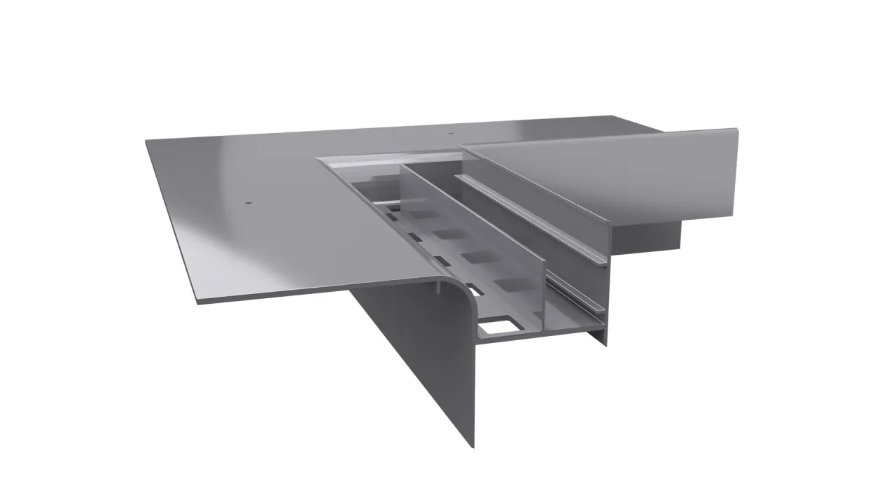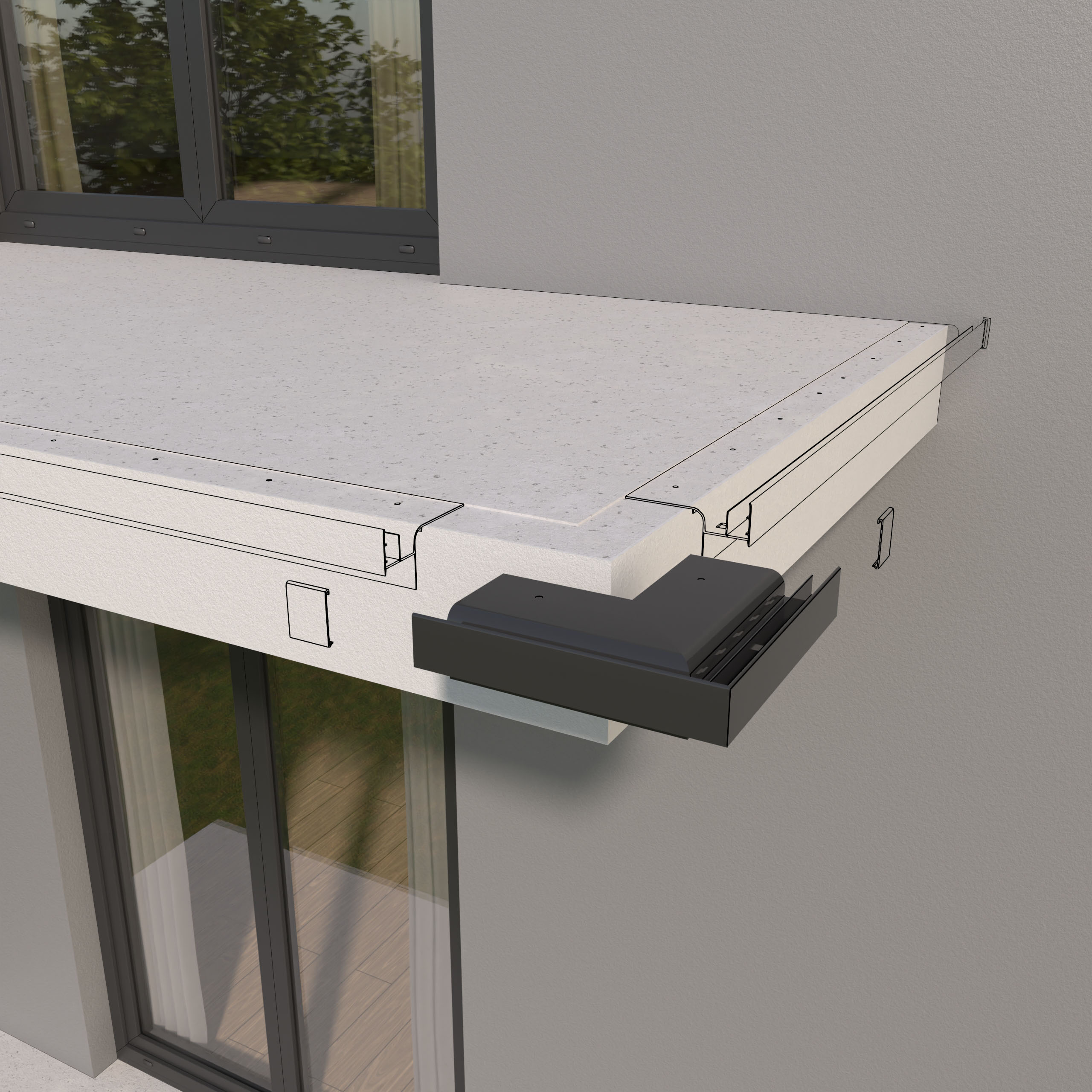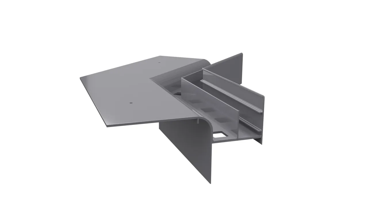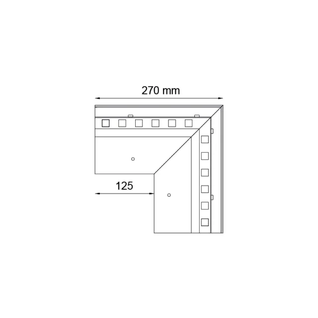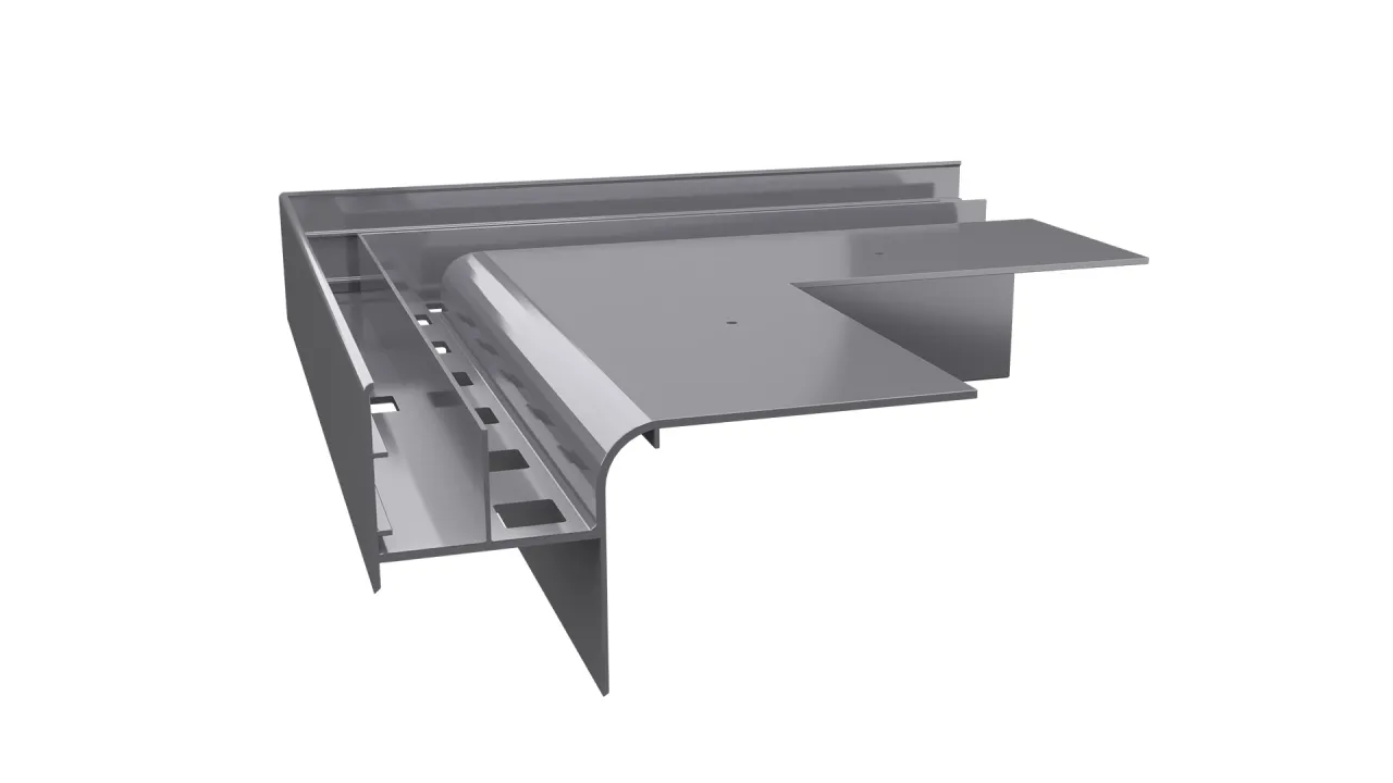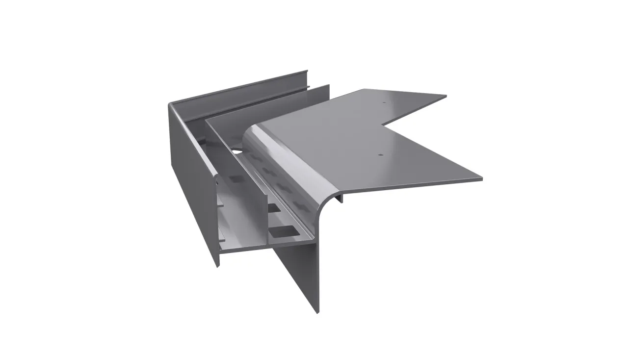 Narożnik W20R stanowi element systemowego wykonania okapu z wykorzystaniem profili W20R i przeznaczony jest do wykończenia zewnętrznych naroży tarasu oraz balkonu.