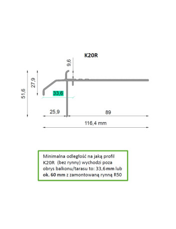 Profil okapowy K20R przeznaczony jest do tarasów i balkonów z posadzkami żywicznymi typu „kamienny dywan”. Wykonany został z materiałów najwyższej jakości, zapewniających pełną odporność na korozję oraz szczelne zespolenie z warstwą izolacji. Konstrukcja profilu oraz otwory drenażowe umieszczone w ściance czołowej umożliwiają skuteczne odprowadzanie wody z posadzki. Maskownica umieszczona pod profilem okapowym pozwala na systemowy montaż aluminiowej rynny R50.
