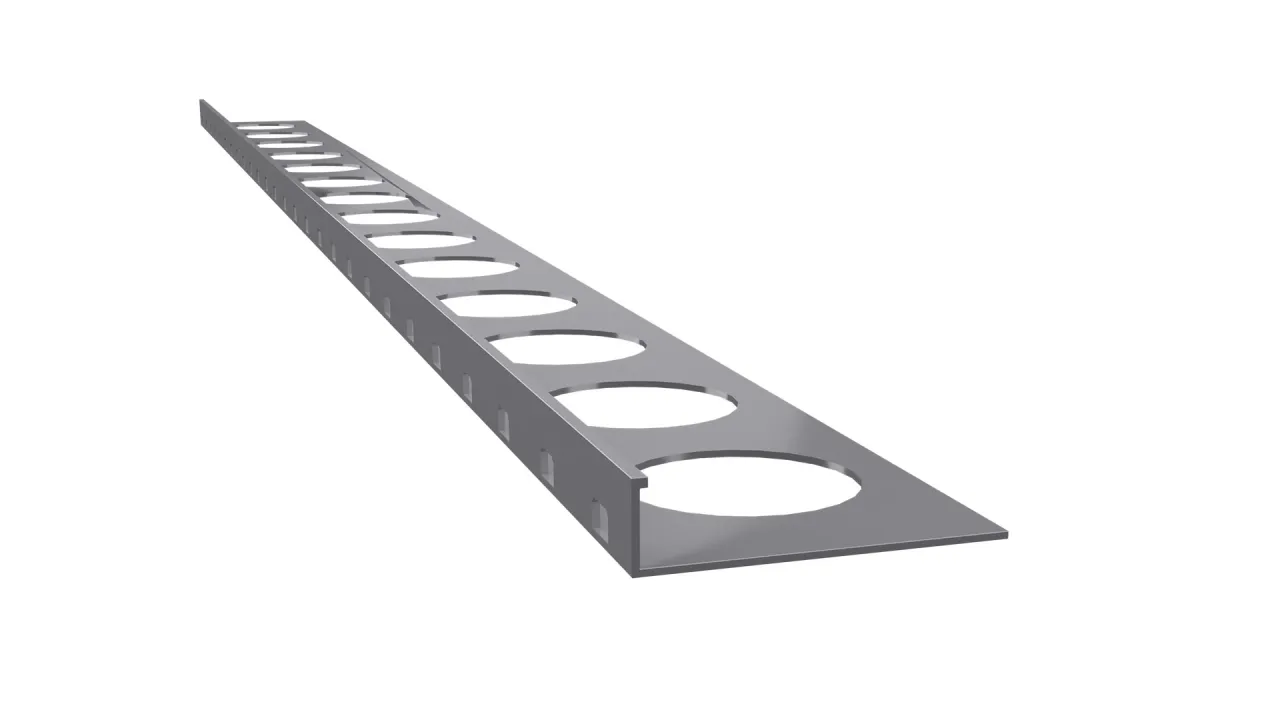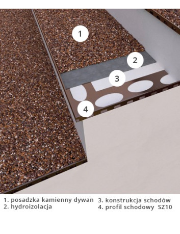 SZ10 to profil przeznaczony do wykańczania krawędzi stopni schodowych z okładziną typu „kamienny dywan” o grubości warstwy 10 mm. Jego unikalna konstrukcja umożliwia zastosowanie jednego profilu do estetycznego wykończenia zarówno krawędzi pomiędzy stopnicą a podstopnicą, jak i pomiędzy stopnicą a policzkiem schodów. Przejście pomiędzy krawędziami realizowane jest poprzez wygięcie profilu, co zapewnia wysoką wytrzymałość oraz estetyczny wygląd. Dodatkowo kształt profilu oraz rozmieszczone wzdłuż otwory umożliwiają skuteczne odprowadzanie wody z warstwy okładziny schodów.