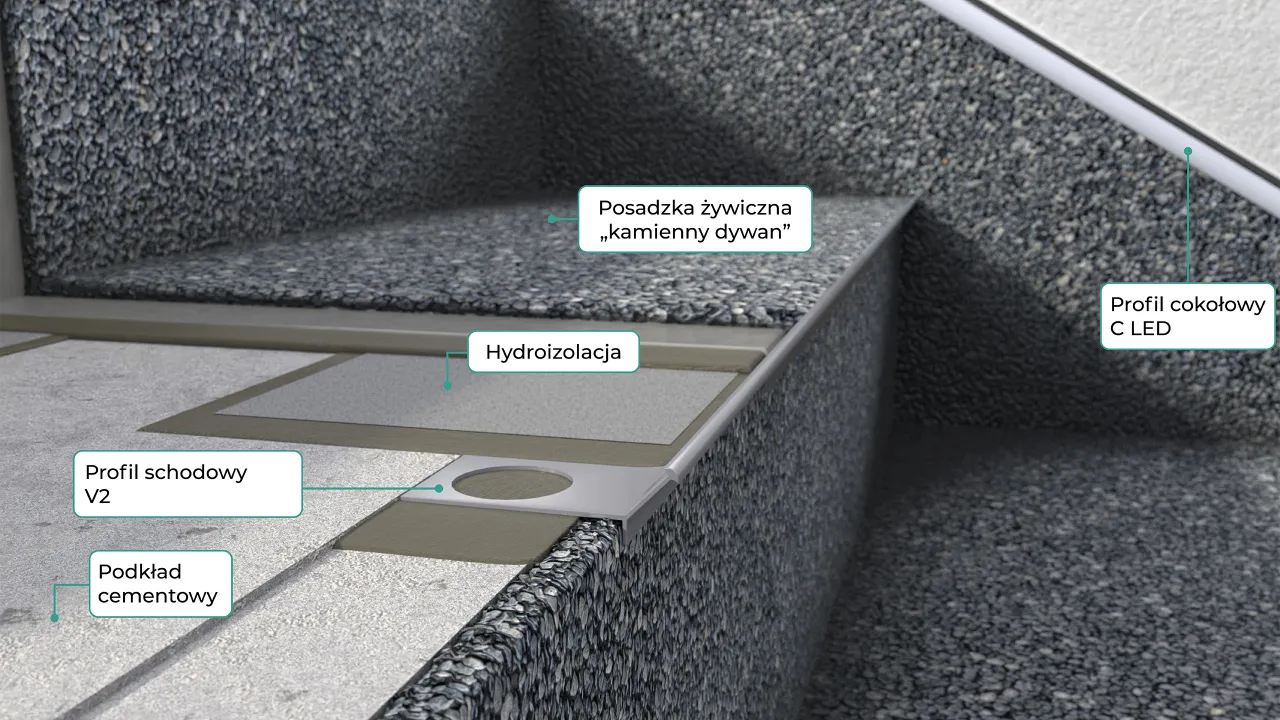 Podstawowy profil schodowy V2 przeznaczony jest do wykończenia i wzmocnienia krawędzi schodów z okładziną wykonaną w technologii kamiennego dywanu, na styku stopnicy i podstopnicy.